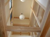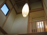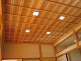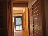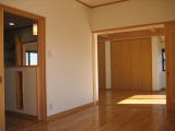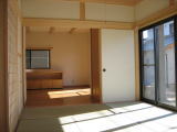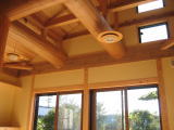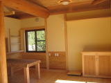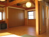 リビングと和室をまとめ、アイランド型キッチンを設置。 壁板は桧で壁と天井は塗り壁です。